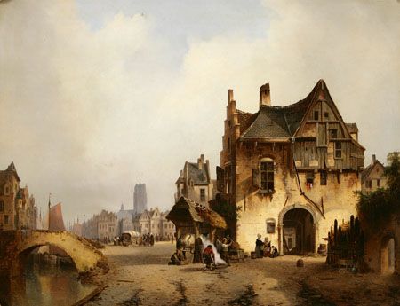 Partie in Antwerpen mit Marktplatz am Kanal und Schmiede.