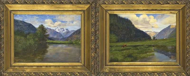Due dipinti raffiguranti paesaggi montani con laghetto