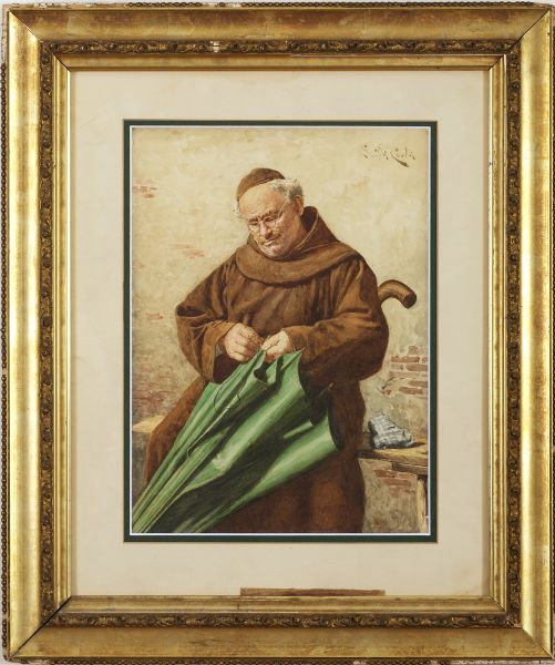 MONK MENDING AN UMBRELLA.