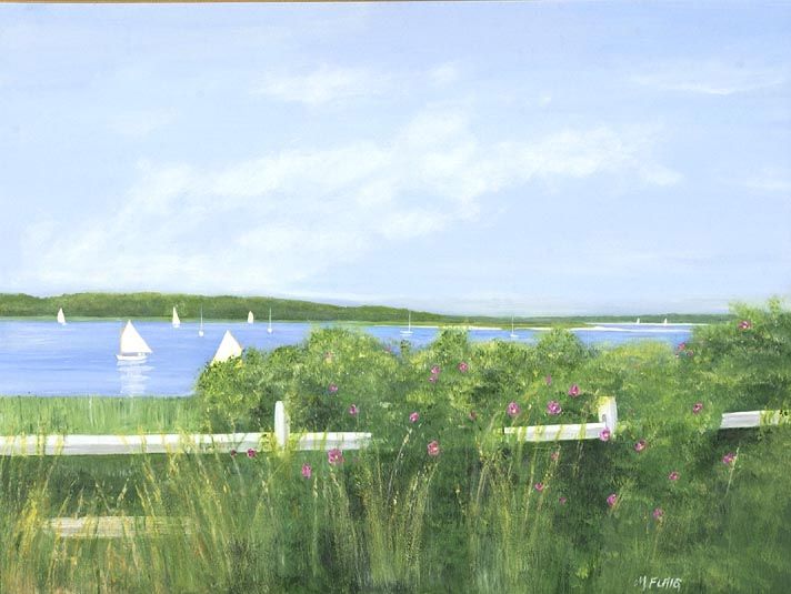 East Bay, Osterville depicting roses over a split-rail fence with bay in distance.