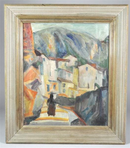 Mountains and village, with figure on stepped walkway.