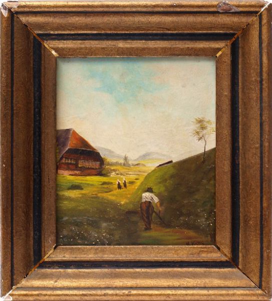 Sommerliche Partie im Schwarzwald. bauernfamilie beim Mähen vor einem Kinzigtäler Gehöft