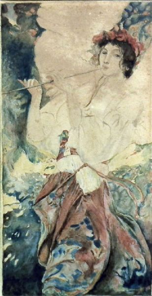 Oriental style painting of a girl playing a flute