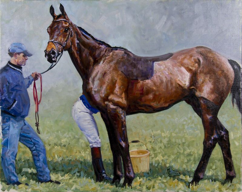 | Equestrian scene, showing a large horse in profile, reigns held by standing figure, beside jockey dressed in blue and white silk | |