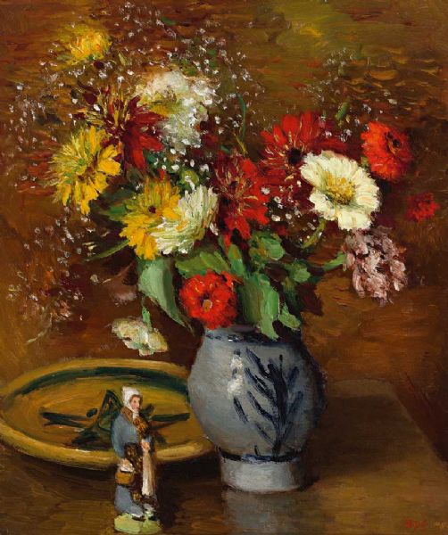 Bunter Blumenstrauß in Steinzeugkrug, Figur und Schale