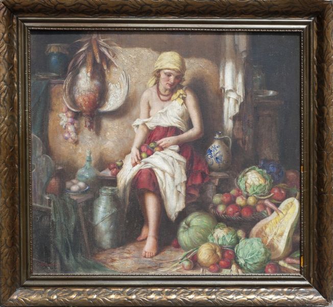 Zátiší s mladou dívkou, zeleninou a ovocem