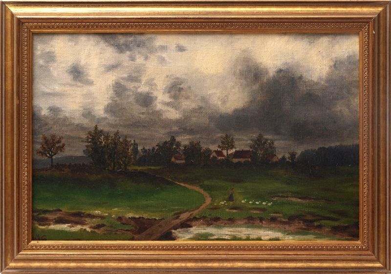 | Weite Landschaft bei Dresden, im Vordergrund eine Magd beim Gänsehüten am Bachufer, im Hintergrund ein kleines Dorf unter gewitt | |