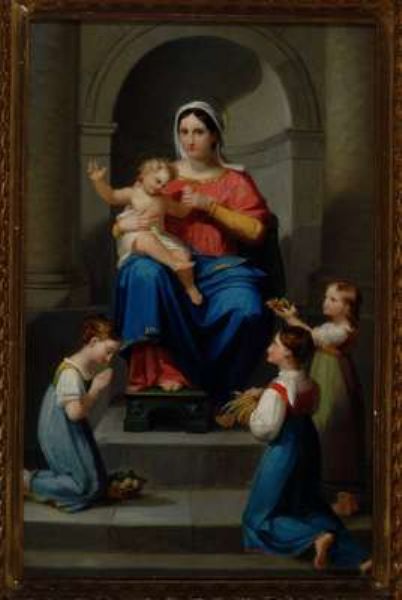 | Maria mit dem Jesusknaben, zu ihren Füßen Kinder, die Feldfrüchte darbringen | |
