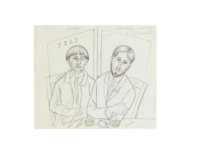 signed in Latin (lower right); further titled 'Soutine et Zborovsky dans le cafe "Rotonde", peintre et poet' (upper middle)