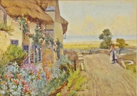 | Timber cottage covered with roses beside bridge with shepherd herding his sheep and a figure watching | |