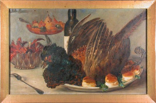 | Gebratener Fasan im Federkleid auf ovaler Platte, umlegt mit Pasteten. Im Hintergrund Aufsatz mit gedünsteten Birnen und Schale | |