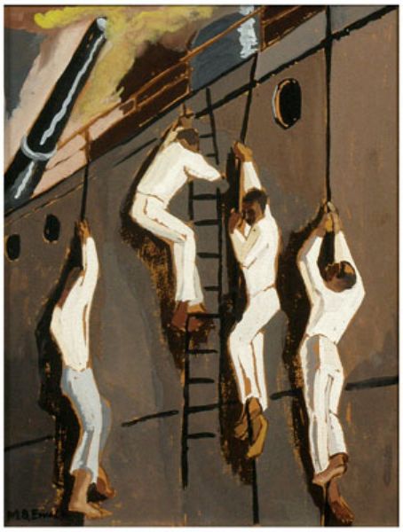 | sailors descending from a ship on ropes and ladder | |