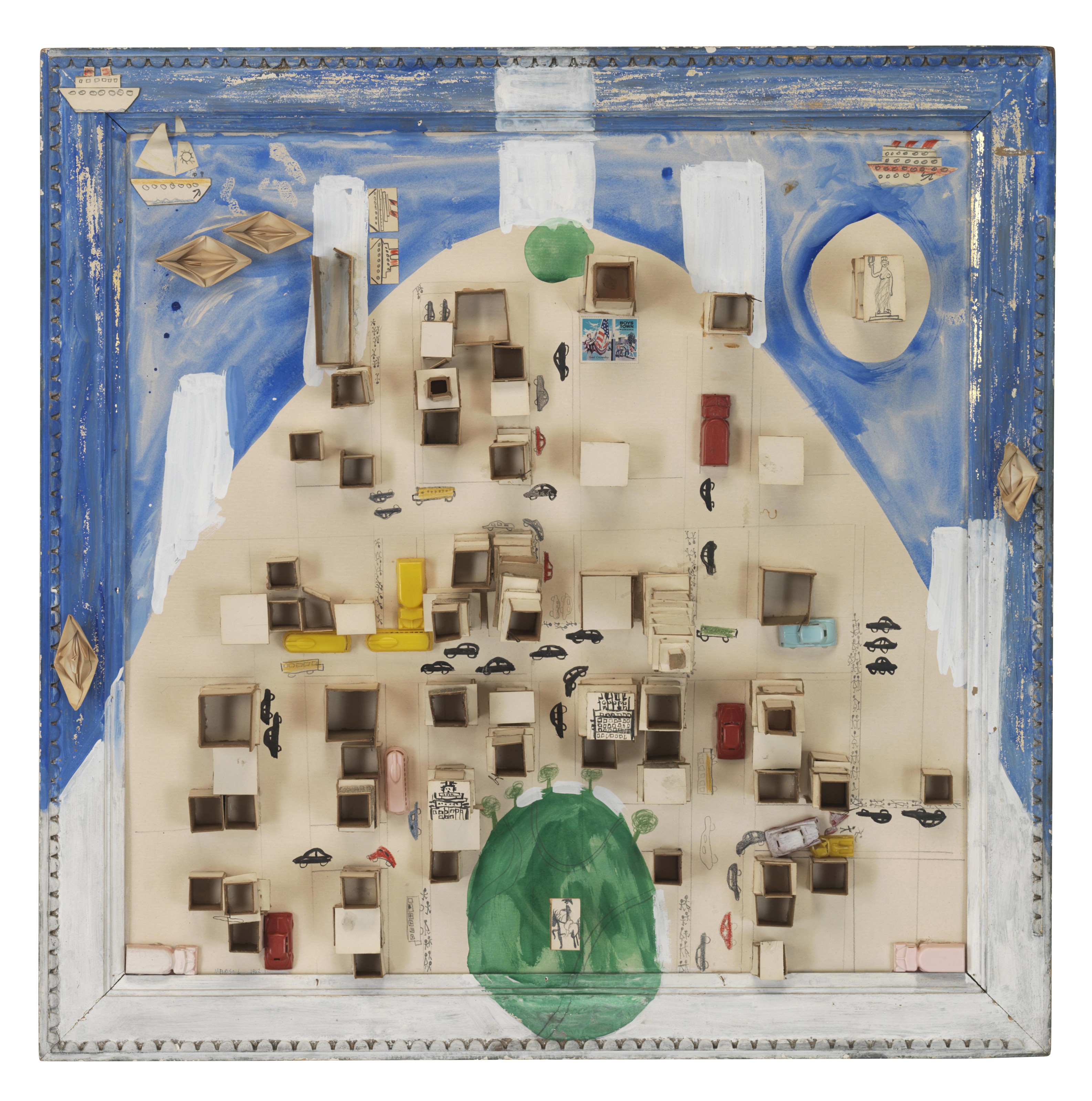 | Cardboard cardboard and painted paper collage, color pencil, plastic toy cars, graphite, gouache, stamps, watercolor and wire, in painted wooden artist's frame | |