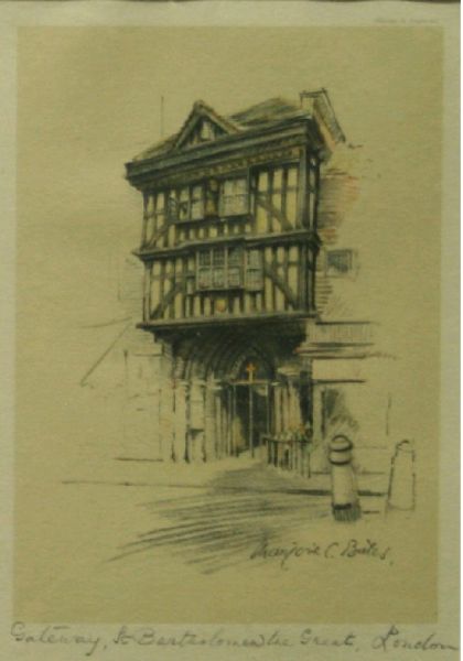 GATEWAY, ST BARTHOLOMEW THE GREAT, LONDON, a partially coloured print of the gatewa