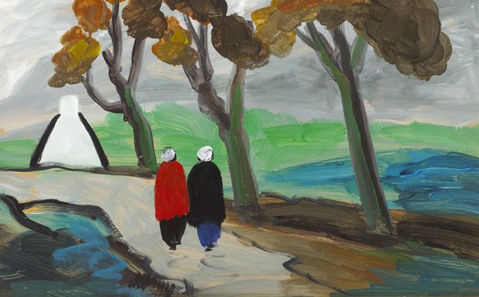 TWO SHAWLIES ON A PATH WITH COTTAGE BEYOND