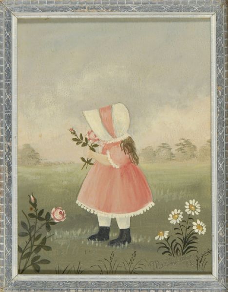 A girl in a pink dress and bonnet smelling a rose