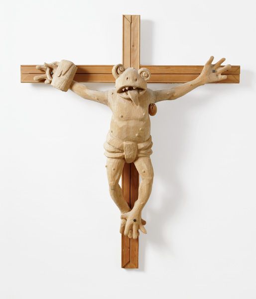 | Wood Carved wooden frog, wooden crucifix and steel nails | |