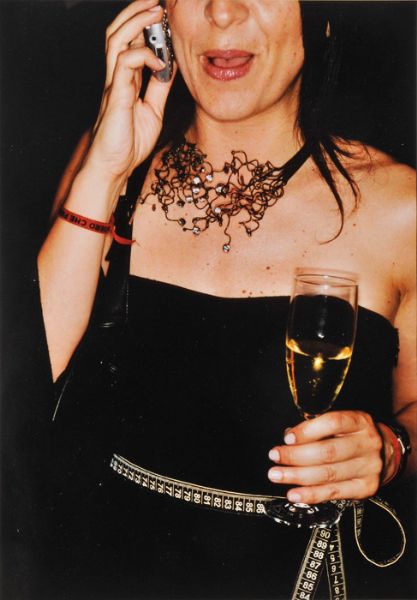 | Truncated portrait of a socialising woman with her mobile phone and a glass of champagne, 2004 | |