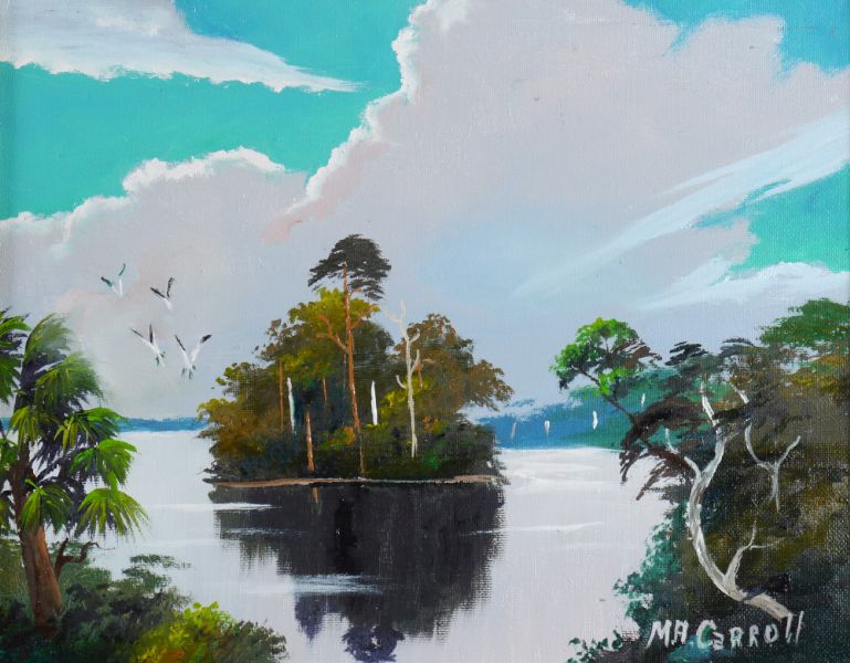Florida Highwaymen backwaters scene with stand of trees and birds