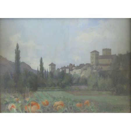 | Continental landscape with a view of a town across fields | |