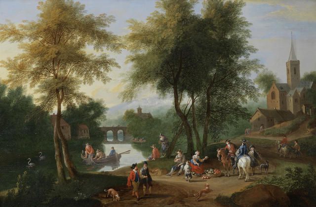 Elegant figures on horseback purchasing fruit from a vendor, in a riverside village