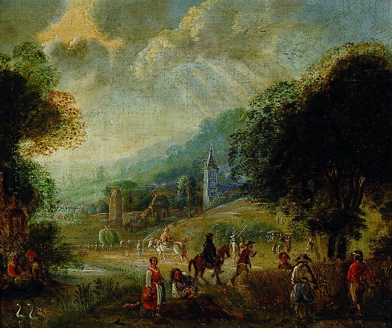 | Brüsseler Malerei, bewaldete ital. beeinflusste Landschaft mit Stadtansicht und Ernteszene, reiche Figurenstaffage mit Reiter un | |