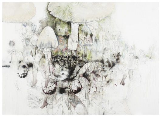 | Encaustic and oil with graphite and ink on cut paper on canvas | |