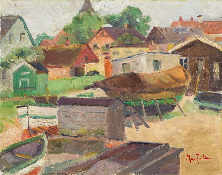 Spreewalddorf und zwischen den Häusern an Land gezogene Boote