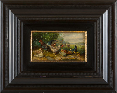 Buntes Hühnervolk und Hahn an kl. Wasserstelle