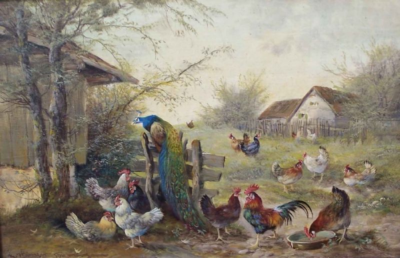 Hühnerhof mit einem Pfau