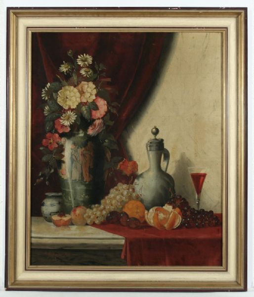 Stilleben mit Weintrauben, Blumenvase und Weinglas