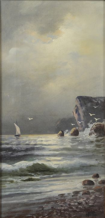 Küstenlandschaft mit Segelschiff vor Steilufer