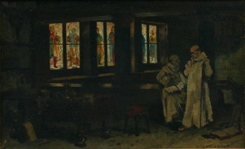 Zwei Mönche im Gespräch vor bunten Glasfenstern.