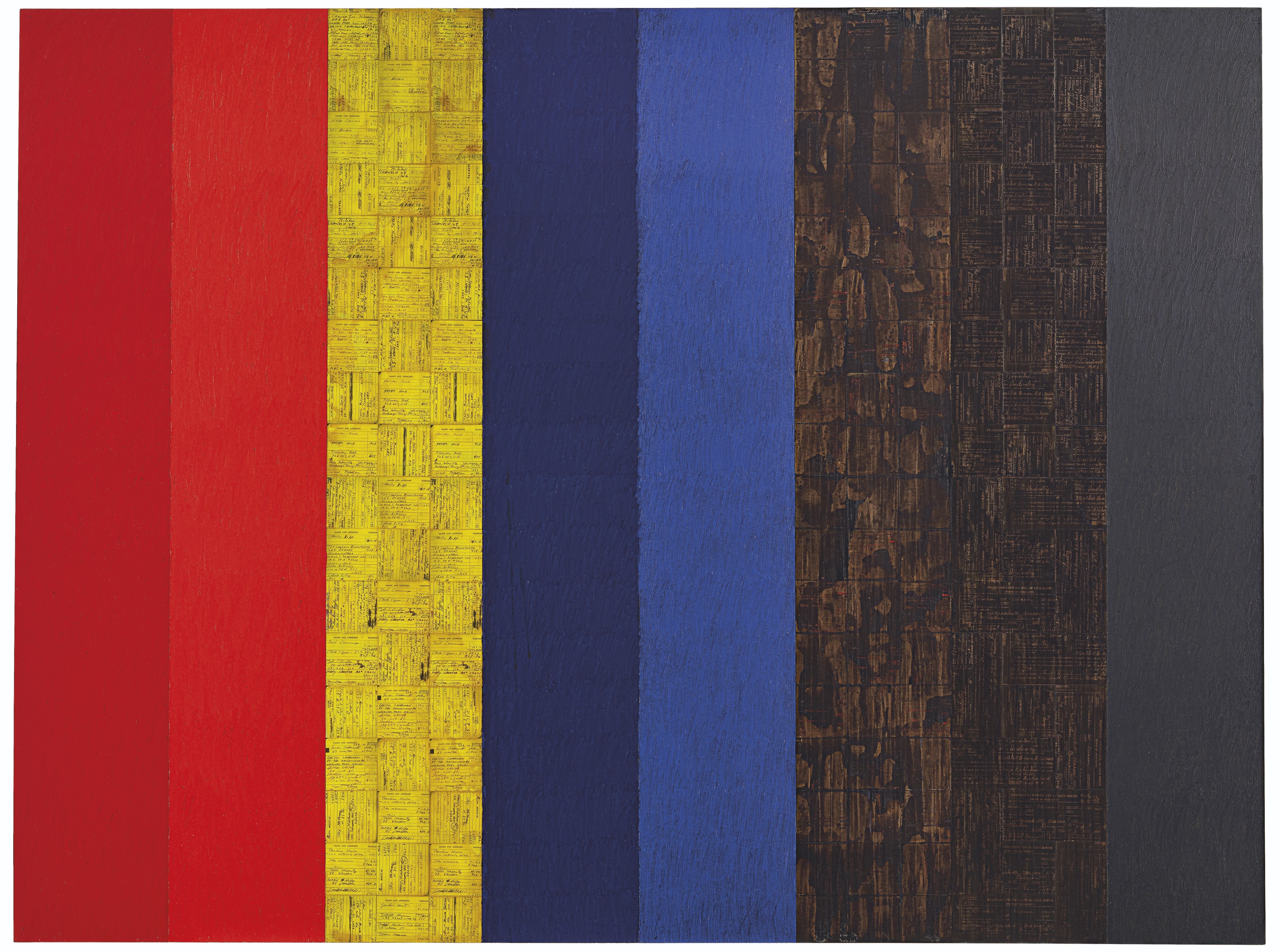 | Oil oilstick, ink and found printed paper collage on Masonite | |