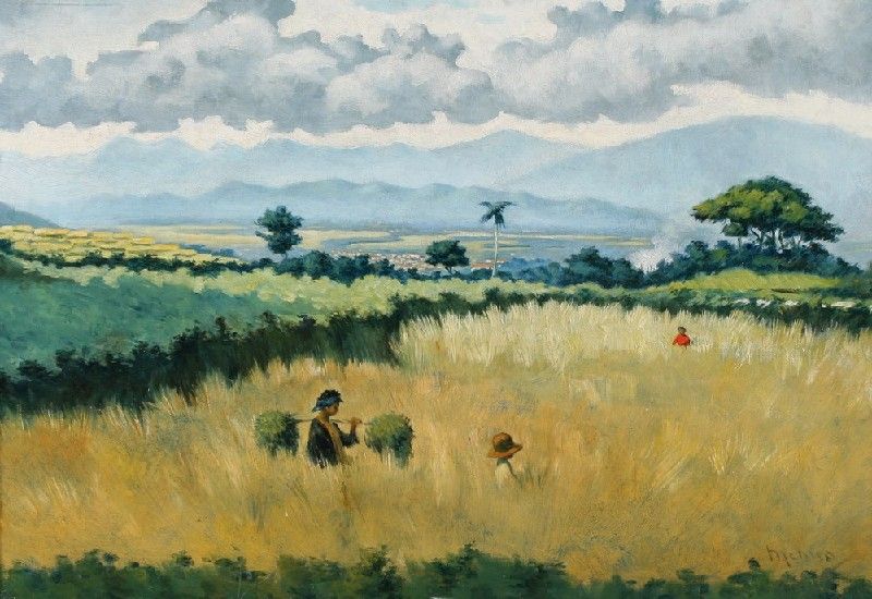 | Indonesisch landschap met boeren op een rijstveld, op de achtergrond een dorpsgezicht tegen een bergketen | |
