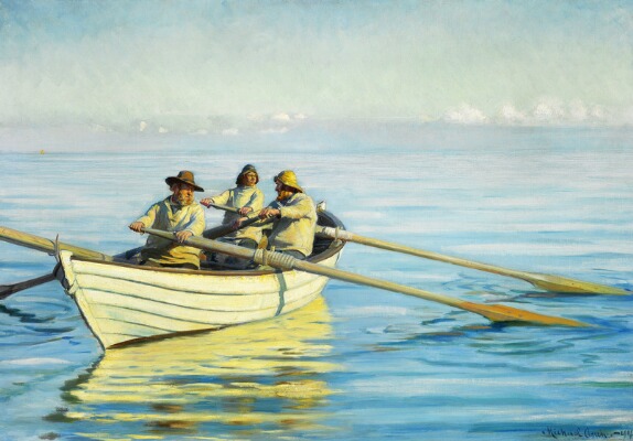 Three fishermen in a rowing boat at sea