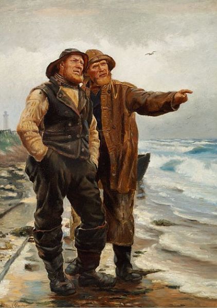| Two fishermen, Ole Svendsen and Anthon Fedder Henriksen. 1879. Study for the principal characters in "Vil han klare Pynten?" | |