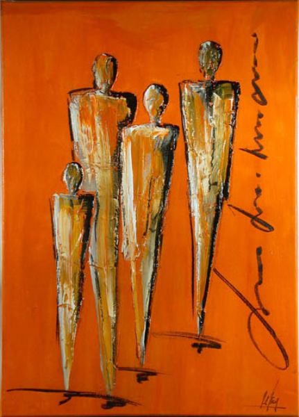 Vier abstrahierende Figuren auf orangefarbenem Grund.
