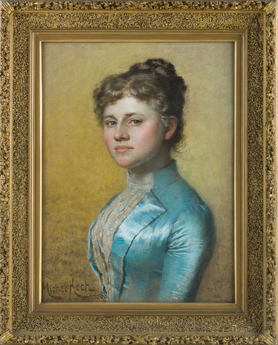 Junge Dame mit dunkelblonder Hochfrisur und blauem Spenzer