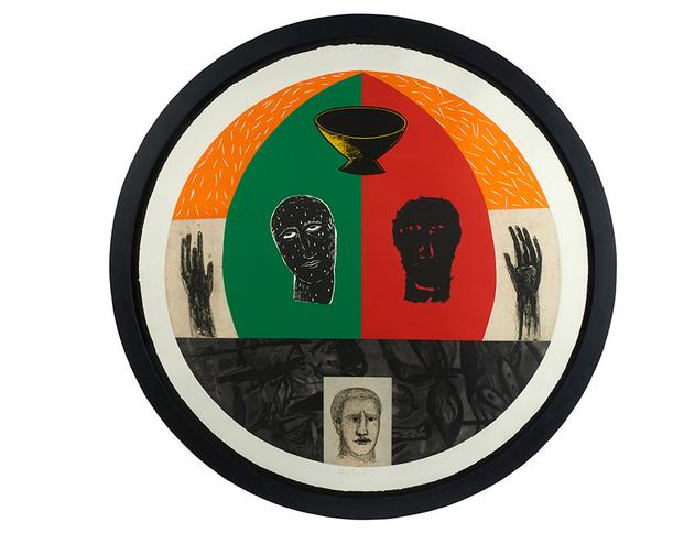 Etching drypoint, aquatin, woodcut, carborundum, silkscreen and cold leaf