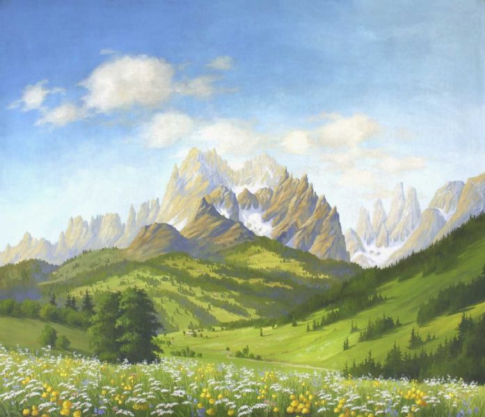 Alpenlandschaft mit vorgelagerter Blumenwiese.