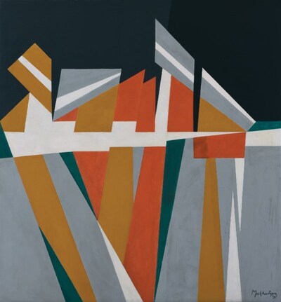 signed and dated 'Mochtar Apin 90' (lower right); titled 'Townscape', signed and dated again, inscribed 'acrylic / canvas 150 x 140 cm, artist's address inscribed (on the reverse)