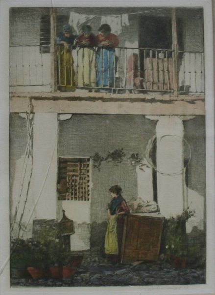 Three Women on a Terrace looking at a Young Woman below