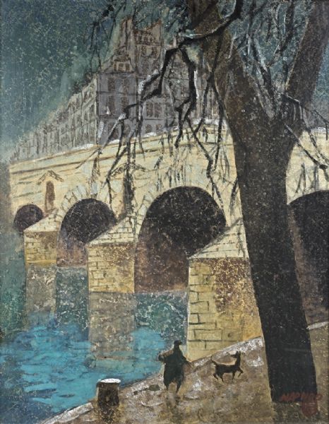 PROMENEUSE ET SON CHIEN SUR UN QUAI DE PARIS.
