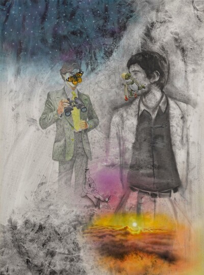 | Acrylic charcoal, coloured pencil, ink, spray paint on paper | |