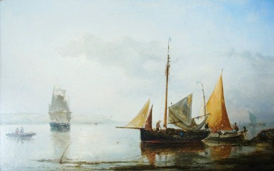 Coastal scene with sailing boats and fishermen offshore