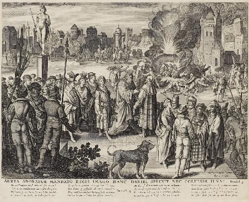 König Nebukadnezar mit dem goldenen Bild und den drei Jünglingen im Feuerofen