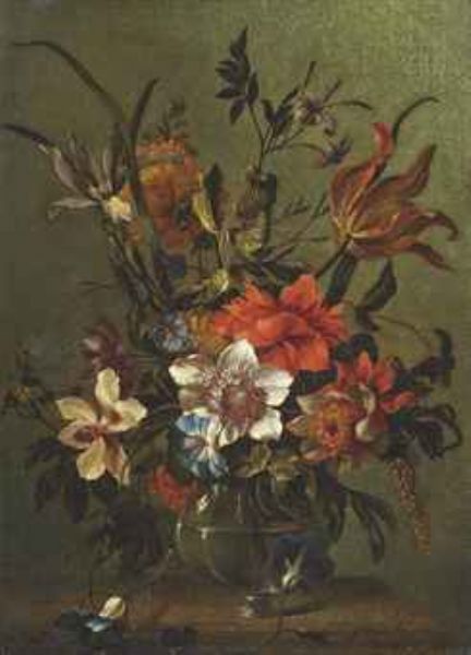 | Tulips, morning glories, peonies and other flowers in a glass vase on a stone ledge | |