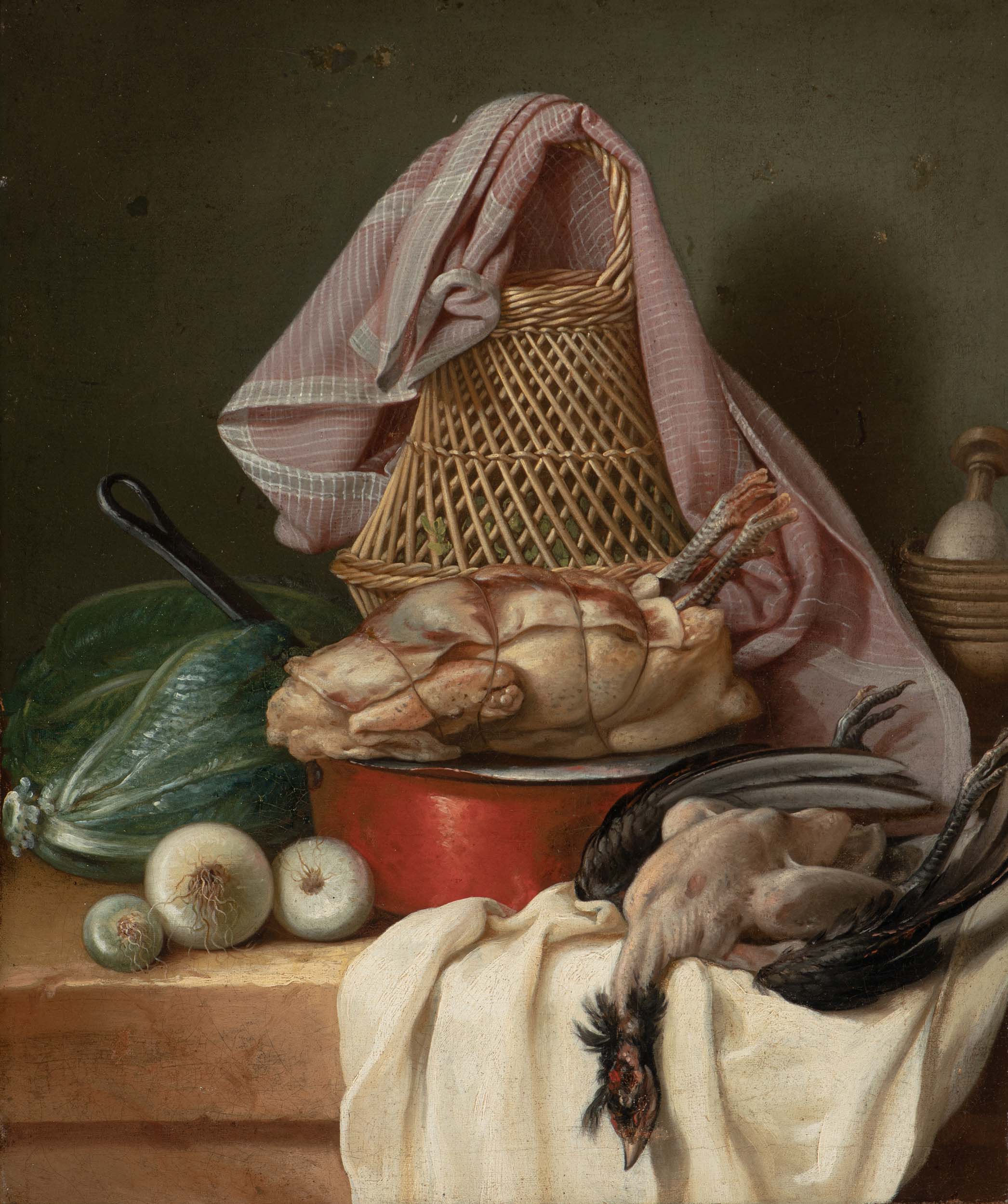 | Still Life of Vegetables, a Roast Pheasant, a Plucked Chicken, a Basket and Cooking Utensils | |