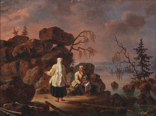 Women on the bank of a lake, presumably in Scandinavia.